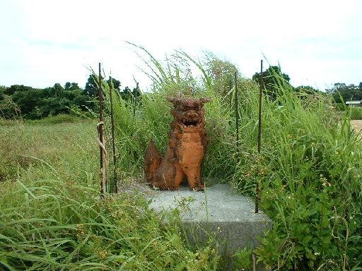 伊原間中学校北の畑に立つシーサー。